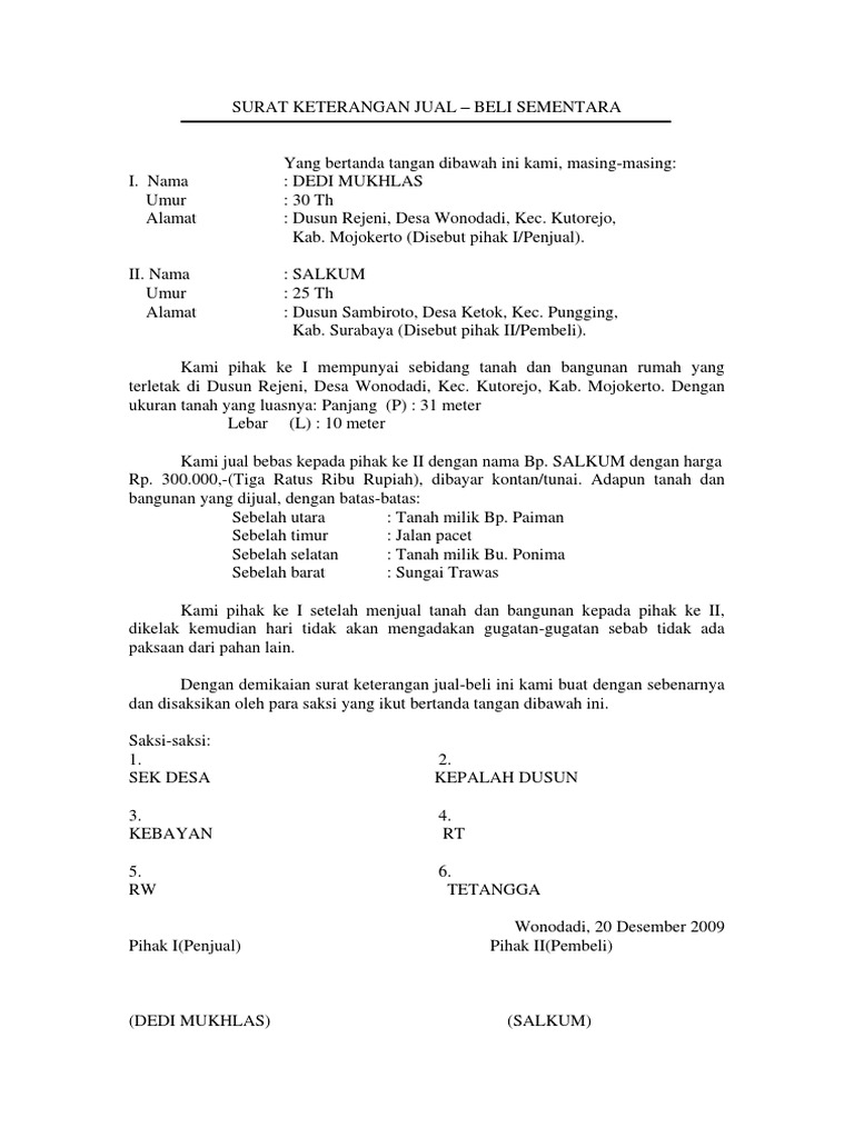 Surat perjanjian jual beli ini dibuat dalam rangkap dua (2) bermaterai, yang mana aslinya dipegang oleh pihak kedua (2) dan tembusannya oleh pihak kesatu (1) dan kedua lembarannya baik yang asli maupun tembusannya mempunyai kekuatan hukum yang sama. Contoh surat pernyataan jual beli tanah dan rumah. Identitas penjual dan pembeli harus tercantum dengan lengkap seperti dalam contoh surat jual beli tanah ini. Kami yang bertanda tangan di bawah ini: Contoh surat keterangan jual beli tanah sebelum diaktakan.